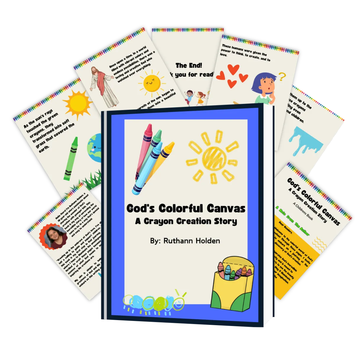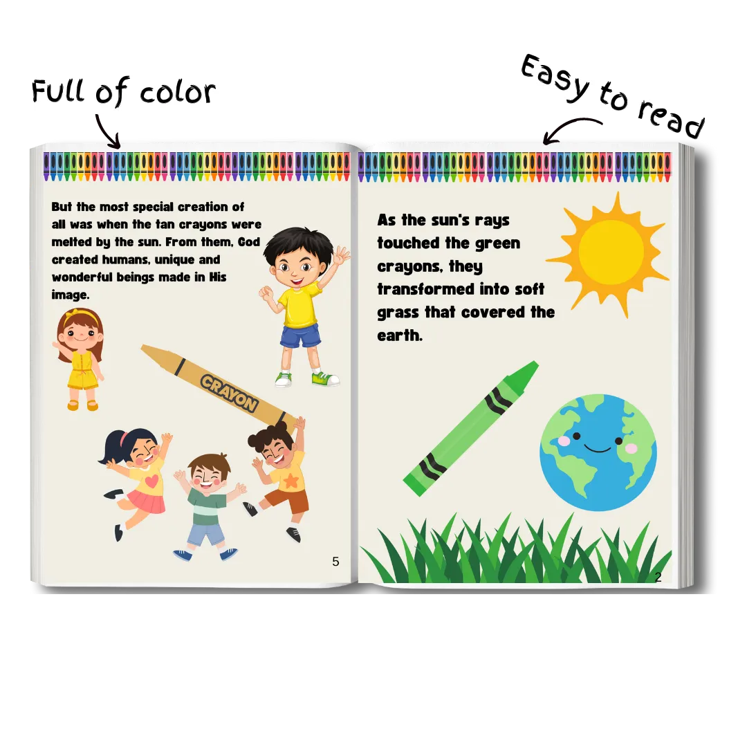 From the first crayon strokes of creation to the joy of the seasons, this story follows God's artistic journey to bring the world to life—grass, oceans, trees, and people—all formed through color, love, and purpose.